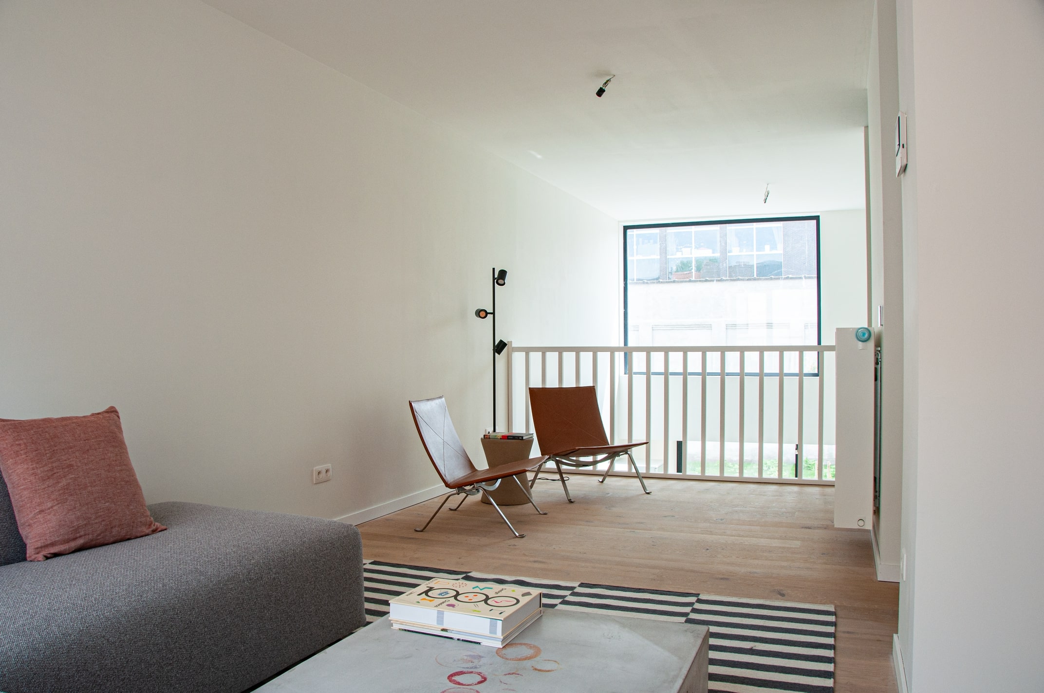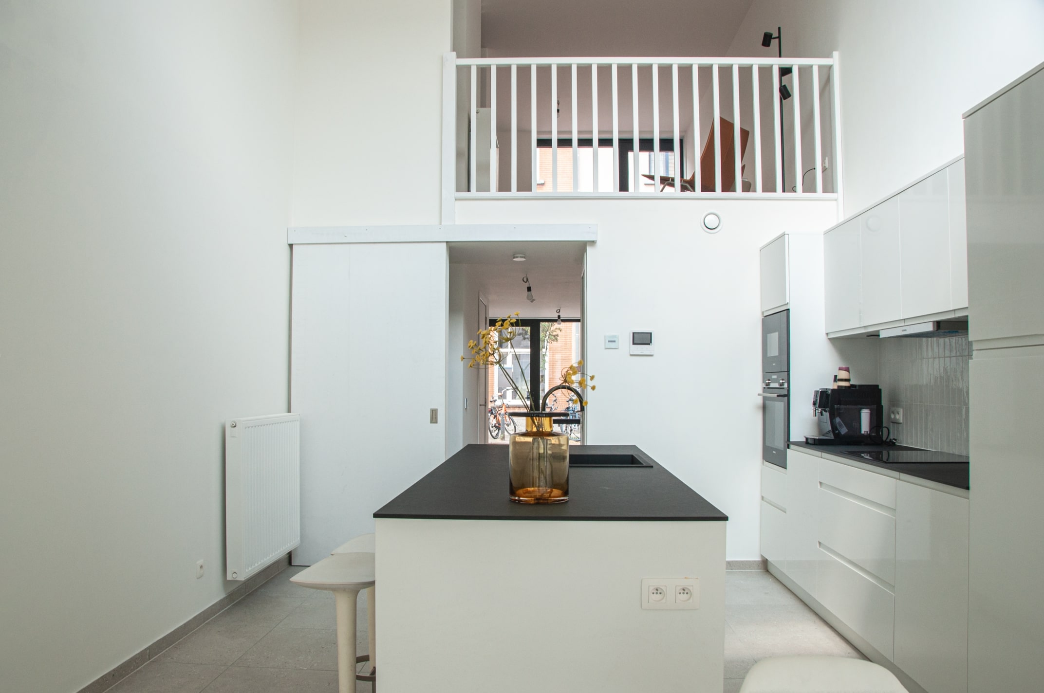 De eerste verdieping bestaat uit een rustgevende woonkamer die indirect verbonden is met de keuken via een vide. Deze vide geeft de woning een uniek karakter en zorgt voor een extra gevoel van ruimte en licht.